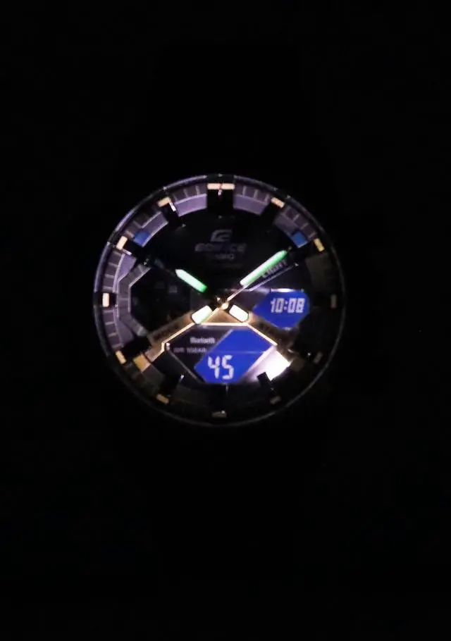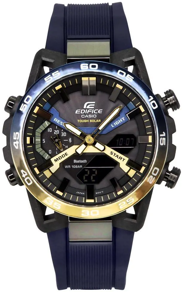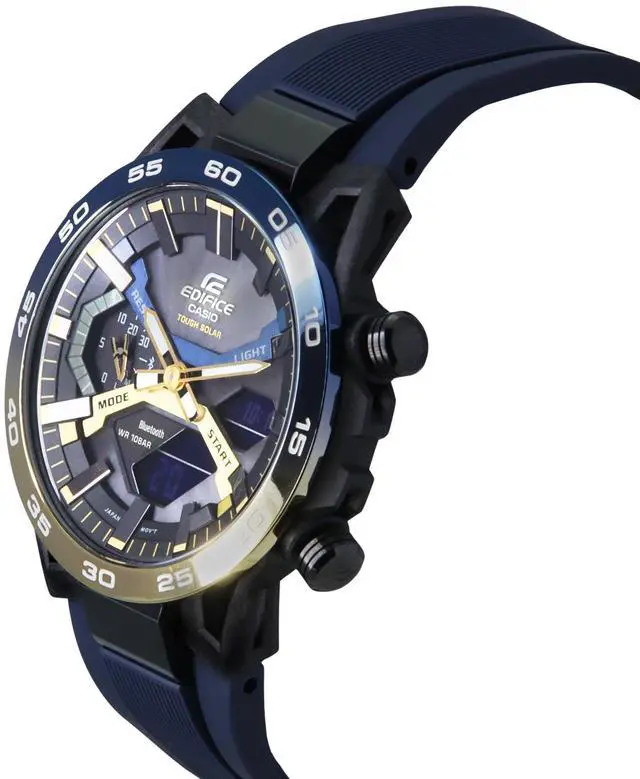 Casio Edifice Sospensione Nighttime Drive Analog Digital Smartphone Link Tough Solar ECB-2000NP-1A ECB2000NP-1 100M Men's WatchThe Casio ECB-2000NP-1A is designed with a carbon composite case and resin strap, featuring a dual-tone blue and gold ion plated bezel. This Tough Solar watch includes an analog-digital display with a black dial and offers advanced functionalities such as mobile link, auto time adjustment, and easy watch setting for around 300 world time cities. It also features a 1/100-second stopwatch, countdown timer, phone finder, and 5 daily alarms. Equipped with luminous hands, a full auto-calendar, double LED light, and 100M water resistance, this watch combines cutting-edge technology with practical style.