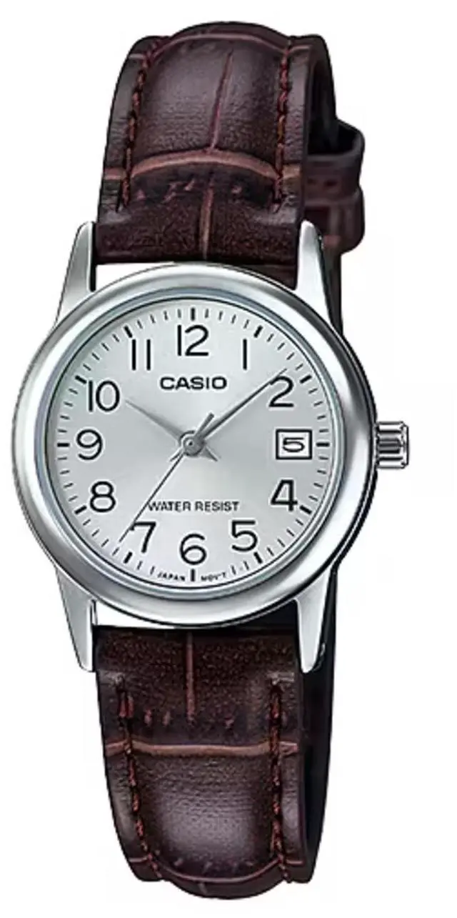 The Casio LTP-V002L-7B2UDF is a classic womens analog watch designed for everyday elegance and practicality. It features a silver dial with clear hour markers and a date display, housed in a polished case and paired with a brown genuine leather strap. With a minimalist design and Water Resistant construction, its ideal for daily wear.