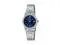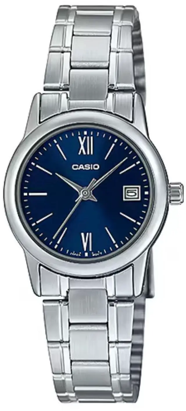 This Casio womens analog watch features a deep blue dial framed by a polished silver tone case for a refined, modern look. Roman numeral accents at 12 and 6 add subtle elegance while maintaining easy readability. The stainless steel bracelet offers a sleek profile that transitions effortlessly from daily wear to dress occasions. A precise quartz movement delivers dependable timekeeping with minimal upkeep. Finished with water resistance for everyday confidence, this watch balances style and practicality beautifully.