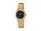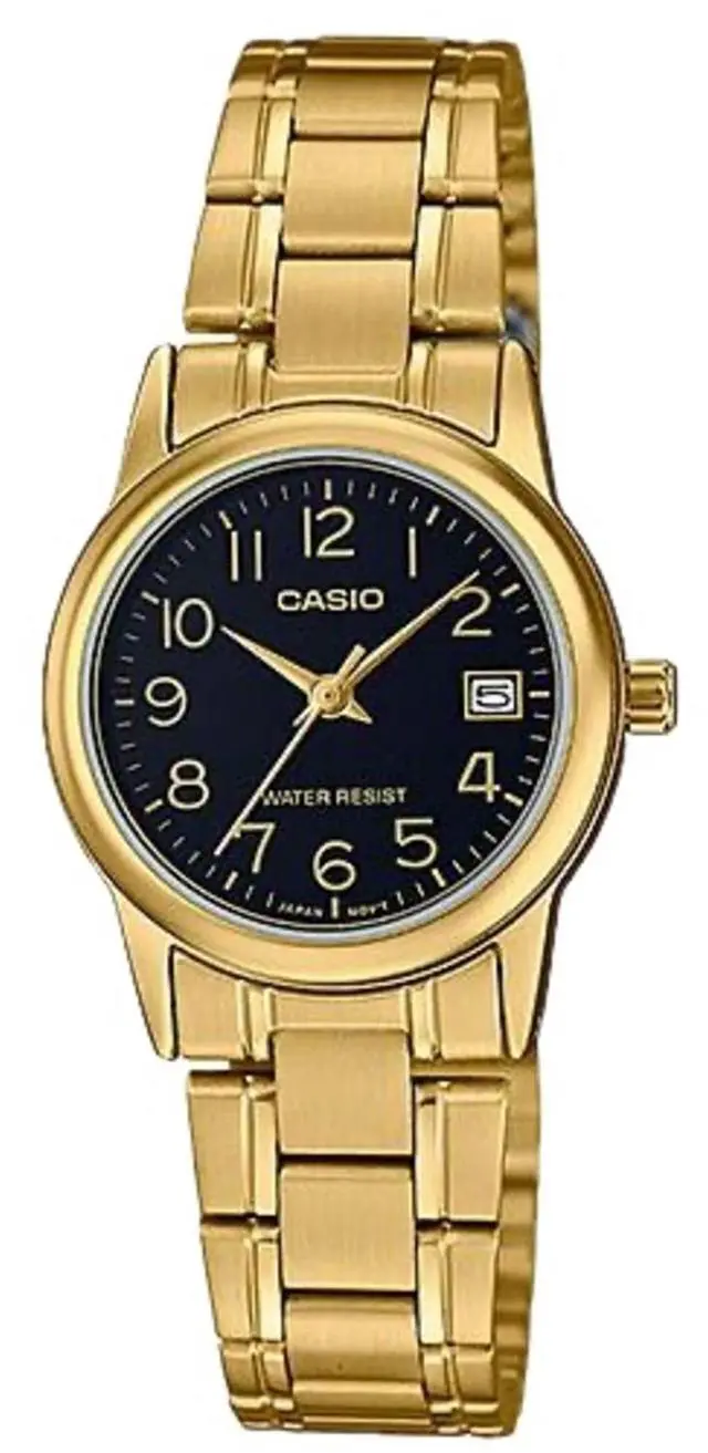 The Casio LTP-V002G-1BUDF is a refined analog ladies watch offering a striking combination of a black dial with gold-tone case and bracelet. Designed with a date display and a minimalist layout, it pairs clean aesthetics with everyday functionality. The gold-tone stainless steel bracelet and case give it a polished finish while the water-resistant build ensures reliable wear for daily use.