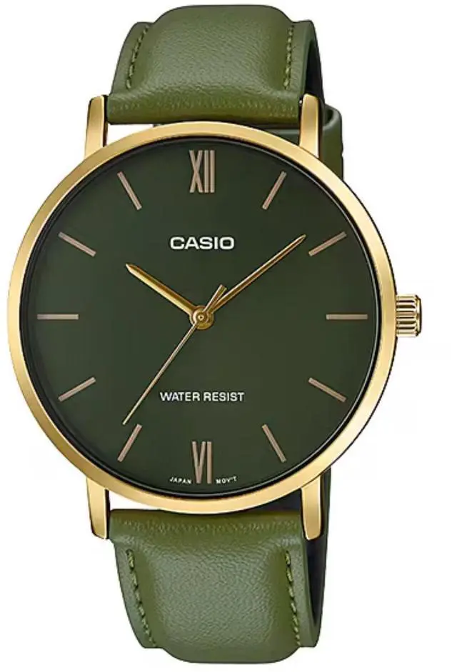 The Casio MTP-VT01GL-3BUDF features a rich green dial paired with a gold tone stainless steel case for a refined modern look. Slim hour markers and minimalist numerals create a clean and balanced dial design. Precision quartz movement ensures reliable everyday timekeeping. A green leather strap adds comfort while enhancing the watchs distinctive color palette. This watch is designed to transition seamlessly from casual wear to polished settings.