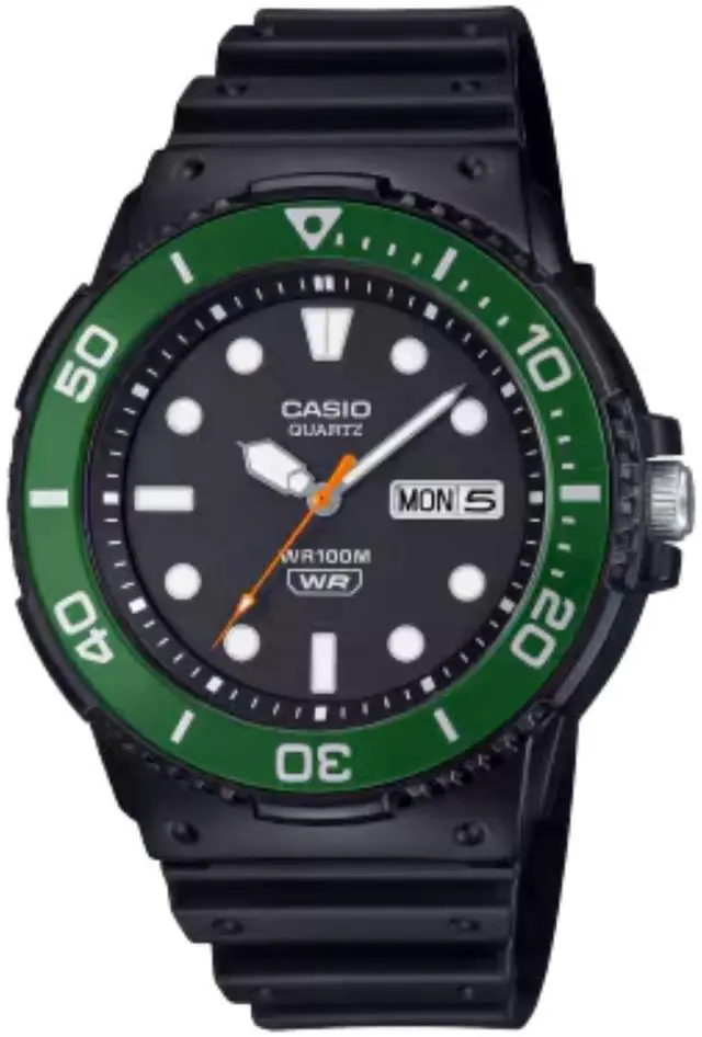 This Casio mens analog watch combines practical functionality with bold sporty styling. The black dial with contrasting accents offers strong readability throughout the day. A durable resin band provides flexibility and comfort for extended wear. The rotating bezel enhances the watchs sporty appearance and usability. Built for everyday reliability, this timepiece works well for both casual outfits and outdoor activities.