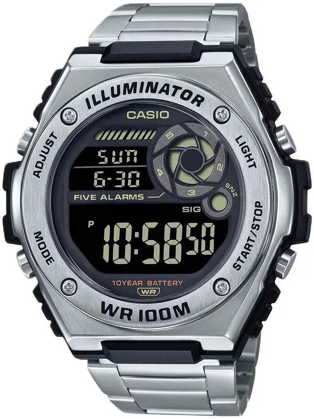 Additional functionalities include a 1/100-second stopwatch, dual time display, and five multi-function alarms, catering to diverse timekeeping needs. Its sporty yet sophisticated design makes the MWD-100HD-1BV a versatile accessory for both casual and active lifestyles.