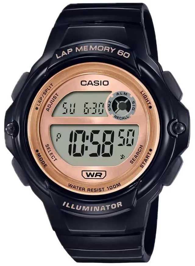 The Casio LWS-1200H-1AVCF is a versatile digital watch designed for active women seeking functionality and style. It features a sleek black resin case and band, complemented by a rose gold-tone bezel, offering a modern and sporty appearance. This timepiece is equipped with a 1/100-second stopwatch that can store up to 60 lap time records, making it ideal for tracking workouts and athletic performance. The countdown timer supports durations up to 24 hours, catering to various timing needs. An LED light with selectable illumination durations ensures readability in low-light conditions, and the dual time feature allows monitoring of two time zones simultaneously.
