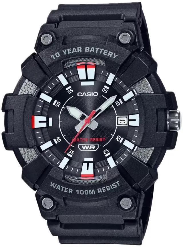 The Casio MW-610H-1AVCF is a robust mens analog sports watch designed for durability and functionality. It features a black dial with red accents, enhancing readability and adding a sporty aesthetic. The watch includes a date display at the 3 oclock position for added convenience. Its sturdy resin case and band ensure longevity, making it suitable for daily wear. With 100-meter water resistance, this timepiece is ideal for swimming and snorkeling. Powered by a reliable quartz movement, it guarantees accurate timekeeping. Additionally, the watch boasts an impressive 10-year battery life, reducing the need for frequent battery replacements.