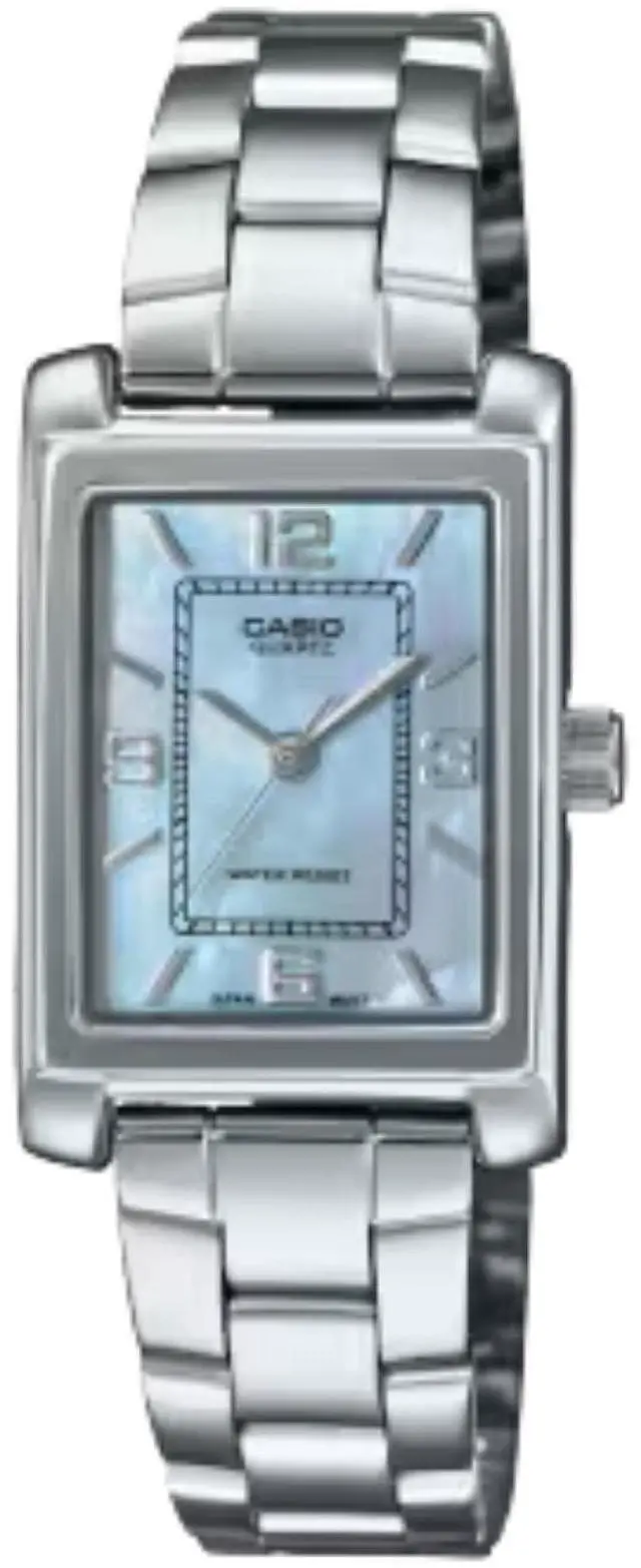 This Casio womens watch features a soft blue dial paired with a polished stainless steel bracelet. The gentle color adds a fresh and elegant touch to a classic design. Its slim case offers a comfortable and refined fit for everyday wear. The analog display ensures clear and effortless time reading throughout the day. Designed for versatility and reliability, it complements both casual outfits and dress occasions.