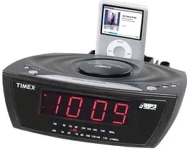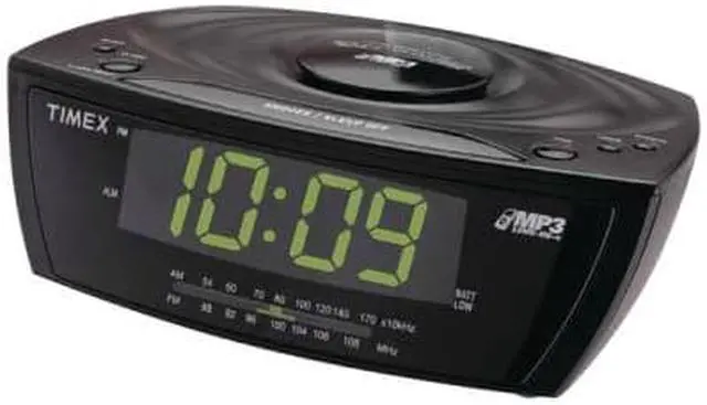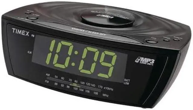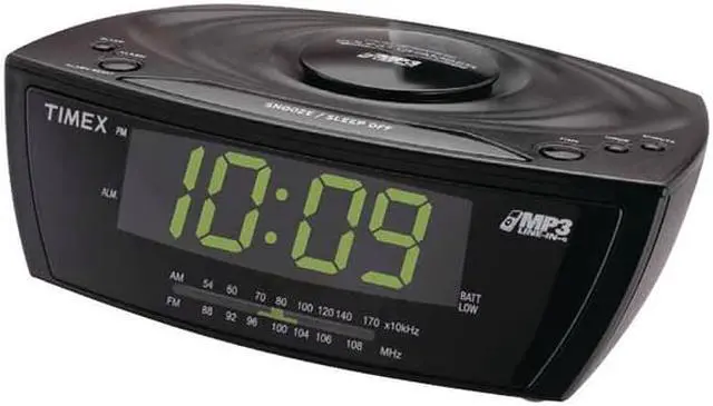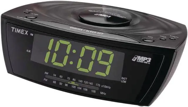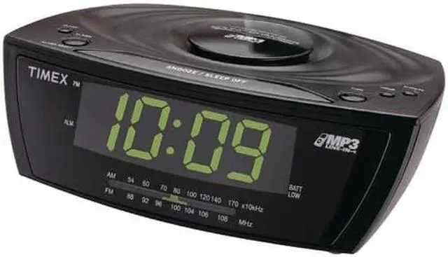 large. 9" green led displayattractive, compact designwake to am/fm radio or buzzersleep to radio with programmable sleep timeradjustable high/low clock display dimmerlarge easy to find snooze buttongentle wake alarm feature wakes user peacefully with ascending volumebattery backup system guards against power failuresline in for aux audio sourcesincludes patch cordupc : 758859205946 dimensions : 7. 50in x 6. 50in x 2. 50inestimated weight : 1. 45.