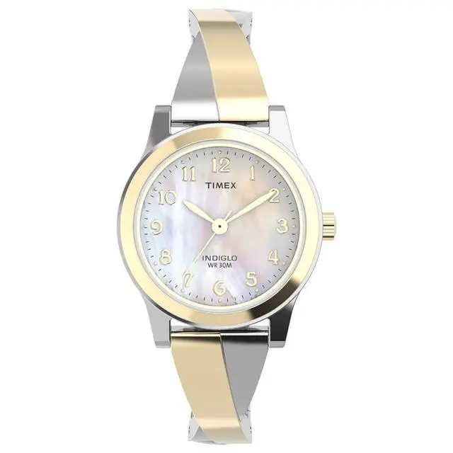 This Timex Fashion Stretch Bangle watch offers a classic and convenient design for women. Featuring a petite 25mm round two-tone brass case and a clear mineral glass crystal it showcases a beautiful mother-of-pearl dial with easy-to-read Arabic numerals. The watch operates with a reliable quartz analog three-hand movement and includes Timexs signature Indiglo night-light for visibility in low-light conditions. Completing the elegant look is a comfortable and adjustable two-tone stainless steel expansion band designed to fit wrist circumferences between 6.5 and 7.5 inches. With a water resistance of 30 meters it can withstand splashes and brief immersion making it suitable for everyday wear.