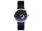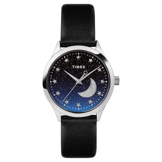 Mineral crystal lens. Blue glitter dial with silver tone case and black strap. The dial decorations include starts and moon. Case 32mm. Band width- 16mm. Quartz movement. Glow in the dark INDIGLO Night-Light display. Water resistant to 30 meters.