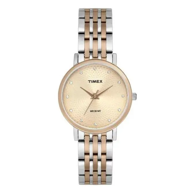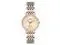 Rose Dial. Quartz movement. 30mm round shaped case. Two tone 7.5 inch bracelet. Mineral glass lens. Two-tone Case.