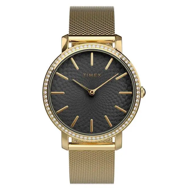 The 34mm Transcend Celestial is an enchanting timepiece featuring a gold-tone case a black dial and a shimmering crystal-set bezel. The stunning dial showcases a celestial motif with sparkling accents all driven by a simple yet reliable quartz movement. The gold-tone bracelet completes the opulent look making it feel like a piece of jewelry. This watch offers a magical refined statement for special occasions or daily elegance.