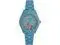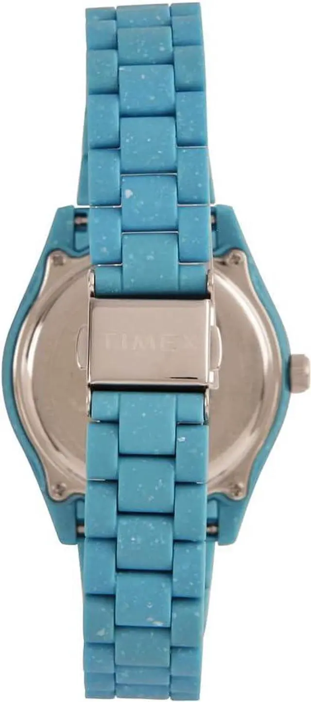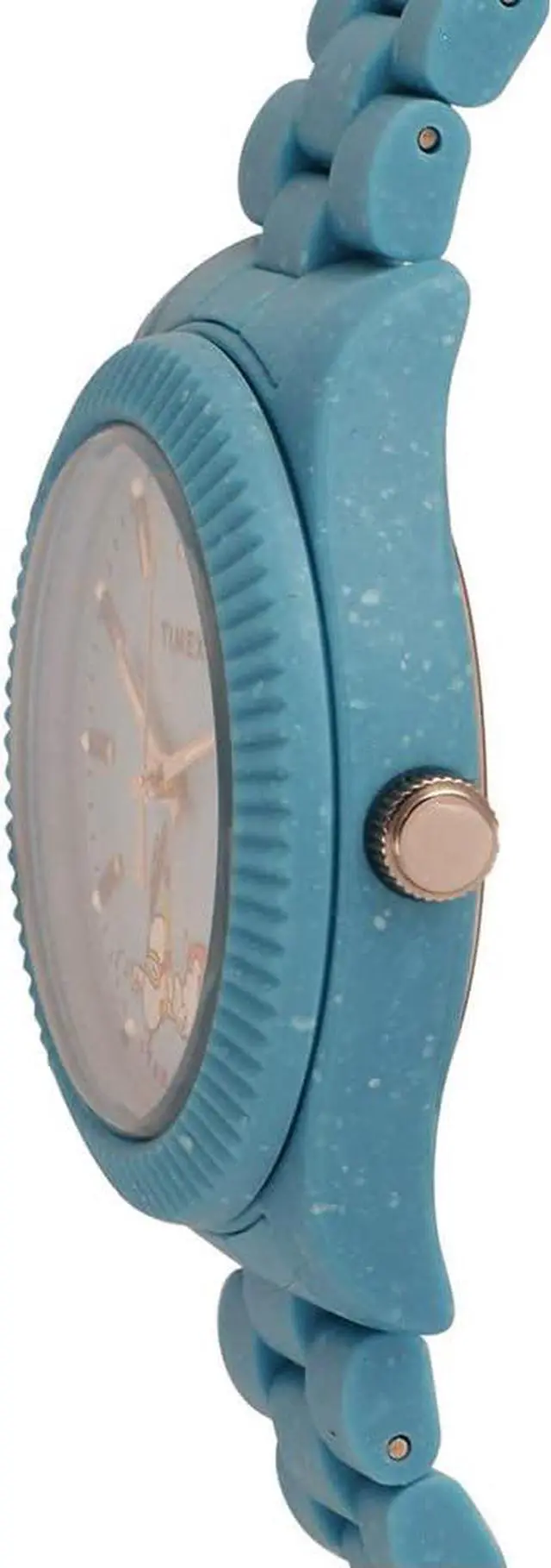 This round blue womens watch features a 37mm PCGF (Polycarbonate Glass Fiber) case which is 11mm thick and a blue analog dial with baton markers protected by a mineral glass lens. It operates on a quartz movement and includes a blue recycled band that is 18mm wide fits wrist circumferences from 135-190mm and is secured with a deployment clasp. The watch is water-resistant to 30 meters.