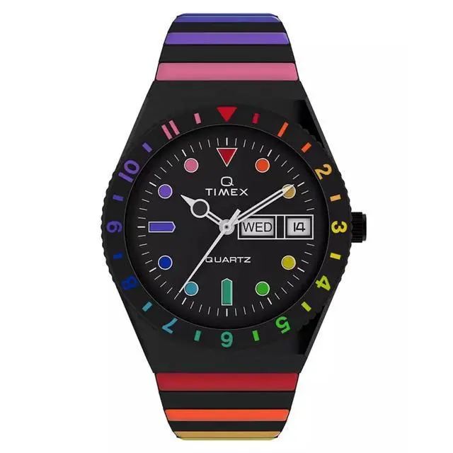 Dive into nostalgia with the 36mm Timex Q Diver Inspired featuring a black case and dial paired with a coordinating black expansion band. This timepiece runs on a reliable quartz movement offering precision and everyday wearability. The iconic Q Timex design is elevated by subtle rainbow accents on the dial giving it a playful fashionable edge. Its the perfect blend of vintage sport style and modern flair making it an excellent accessory for any casual look.