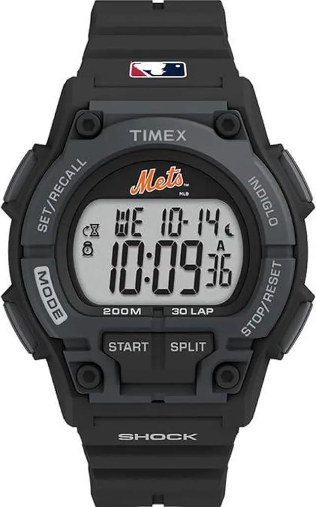 Show your support for the New York Mets with this stylish and functional digital watch. The teams logo and colors are prominently displayed on the dial making it a must-have for any fan. The black case and strap offer a sleek and modern look. Timex Mens x MLB Mens Takeover New York Mets Black Digital Watch.