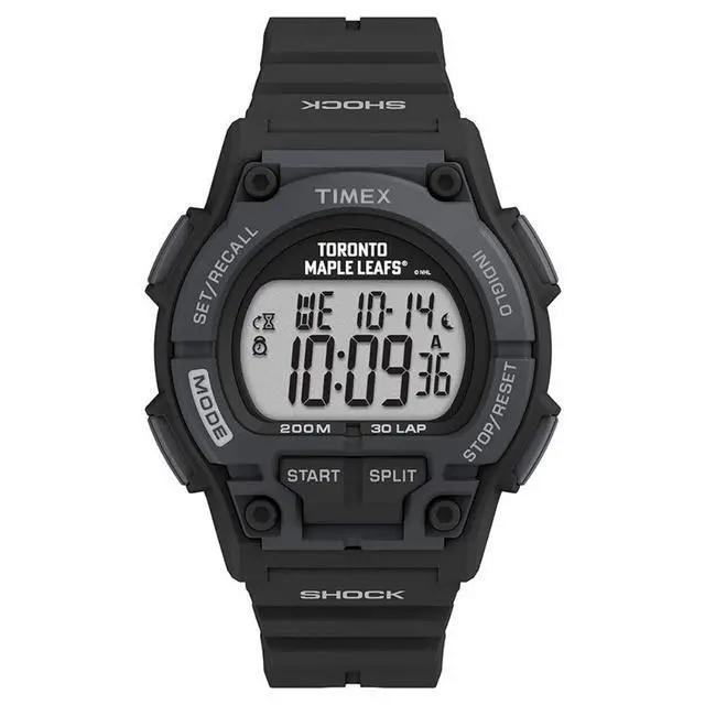 The Timex Mens NHL Takeover 42mm Digital Watch is a high-performance timepiece designed for hockey fans. It features a bold and sporty design with NHL Toronto Maple Leafs branding. Rugged Design- Durable resin case and strap for active lifestyles. 100-Hour Chronograph- Track your workouts and activities with precision. Multiple Alarms and Timers- Stay organized and on schedule. 24-Hour Military Time Mode- Versatile timekeeping options. 2 Time Zones- Ideal for travelers. INDIGLO Night-Light- Ensures clear readability in low-light conditions. Adjustable Strap- Fits a wide range of wrist sizes. NHL Team Branding- Show your team spirit.