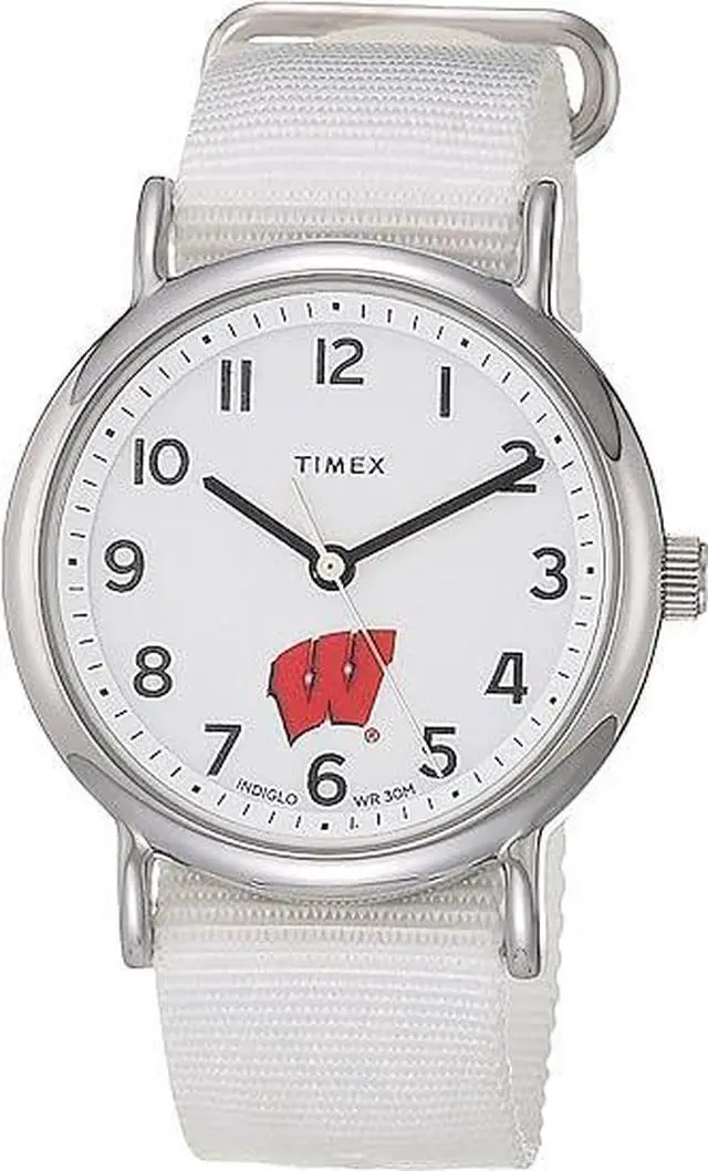 • Timex Tribute Womens Collegiate Weekender 38mm Watch - Wisconsin Badgers with White Fabric Slip-Thru Strap.