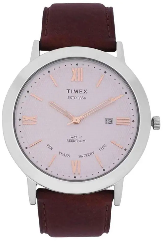 Genuine leather brown strap. Case/Bezel Material- Brass. Water Resistance Depth- 30M. Power Source- Battery Powered with 10 year reserve. Clasp Type- Buckle. Dial Color- Silver. Water resistant- 30 Meters. Strap width- 22 mm. Dial width- 27 mm. Water-resistant.