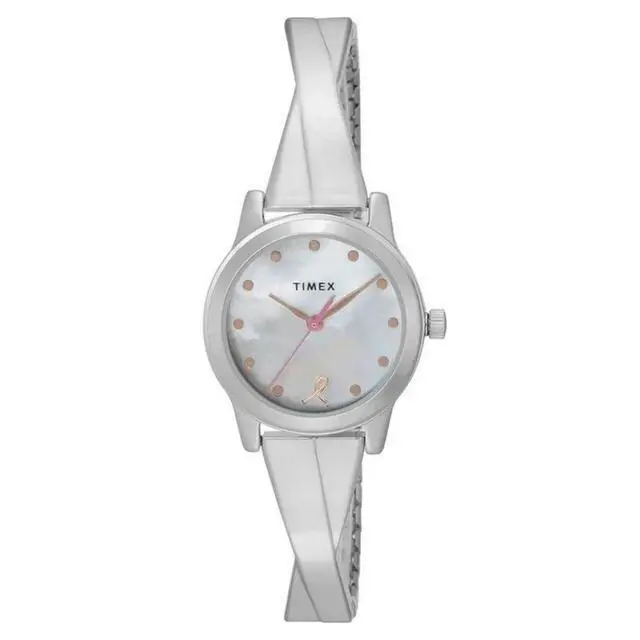 A sophisticated ladies dress watch. Features a classic white mother-of-pearl dial with index markings. Housed in a sleek brushed and polished steel case. Equipped with a precise quartz movement and shatter-resistant mineral glass. Offers 3 ATM water resistance and a screw-down crown for added durability.