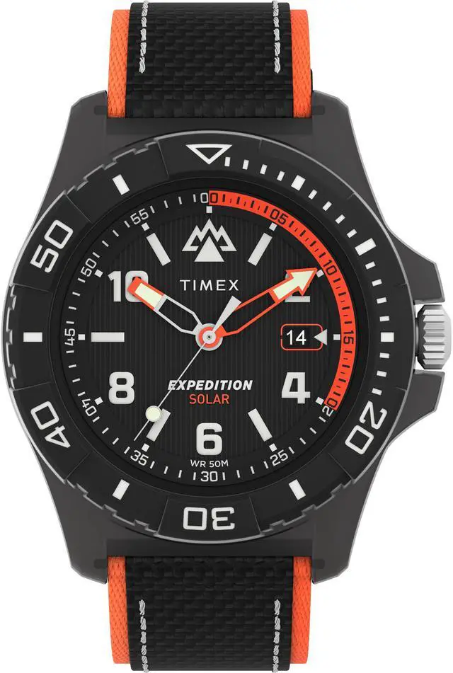 Designed for environmental resilience the 46mm Expedition North Freedive features a durable black case made with upcycled ocean plastic (tide material) and a black fabric strap. The robust design includes high water resistance and the time is kept precisely by a reliable quartz movement. The black dial and case give it a tactical all-black aesthetic suitable for the outdoors. This watch is a rugged tool built for adventure while prioritizing sustainability.