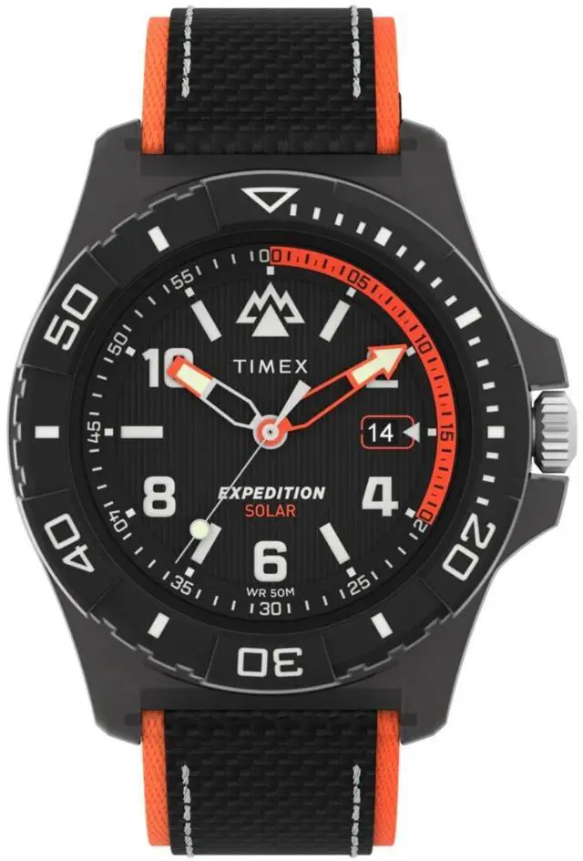 Designed for environmental resilience the 46mm Expedition North Freedive features a durable black case made with upcycled ocean plastic (tide material) and a black fabric strap. The robust design includes high water resistance and the time is kept precisely by a reliable quartz movement. The black dial and case give it a tactical all-black aesthetic suitable for the outdoors. This watch is a rugged tool built for adventure while prioritizing sustainability.
