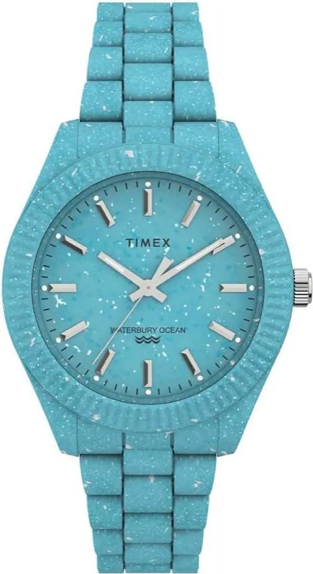 The Timex Waterbury Ocean represents a pioneering step in sustainable watchmaking featuring a 37 mm case material and matching case color crafted from upcycled blue tide ocean-bound plastic in a classic round watch shape with a matte case finish. This eco-friendly analog display is powered by a highly accurate quartz movement and showcases a marine-inspired light blue dial color with unique flakes of recycled material and luminescent hands and markers for visibility in all conditions. The watch is paired with a durable blue tide ocean material strap material and strap color featuring an 18 mm strap width secured by a professional-grade deployment clasp type.