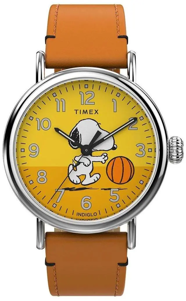 A fun collectors piece the Timex Mens Waterbury Peanuts watch operates with a reliable Quartz Analog movement. It features a playful Basketball theme on a striking yellow dial. The 40mm silver-tone case is paired with a classic brown leather strap.