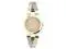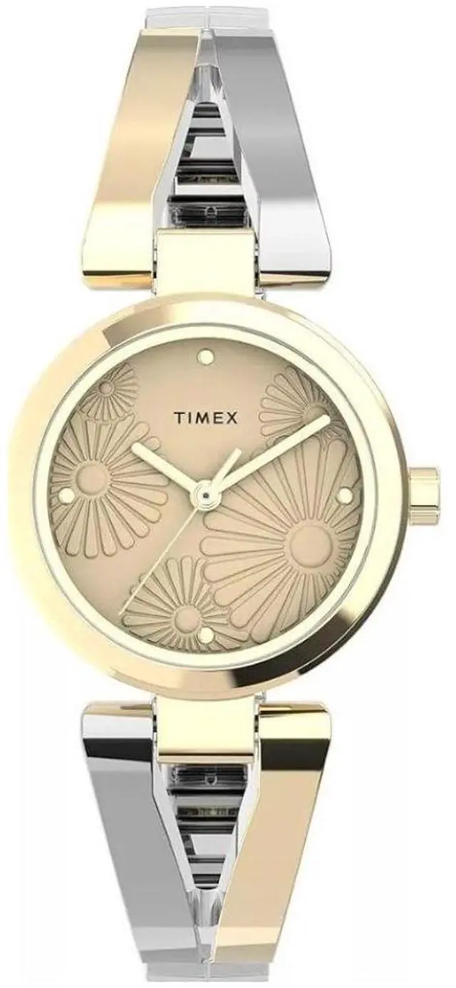 Two-tone stainless steel expansion band. Fits up to 7.5 inch wrist circumference. Champagne dial with partial markers. Gold tone 25mm brass case. Mineral glass crystal. 6mm lug width. Embossed floral pattern on dial. Water resistant to 30m.