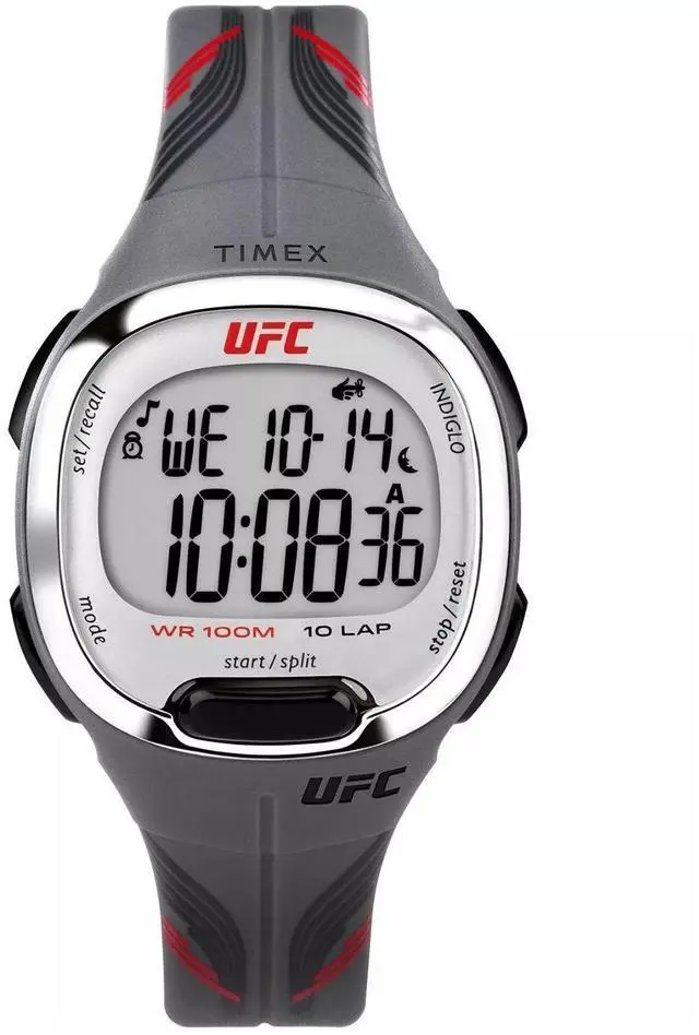 This 33mm UFC Takedown watch is built with a tough gray resin strap and case featuring a clear digital display and multiple timing modes. The reliable quartz digital movement provides all the essential functions for training including a stopwatch. Its compact size and durable construction make it an ideal no-nonsense accessory for the gym or everyday active use. This watch embodies the strength and resilience of the UFC.