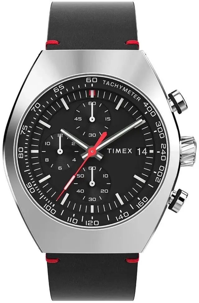 The Timex Mens Legacy Tonneau watch is powered by a reliable Quartz Analog movement. It features a distinctive Tonneau (barrel-shaped) stainless steel case maintaining a sleek bold aesthetic with a matching black dial and a comfortable black leather strap.