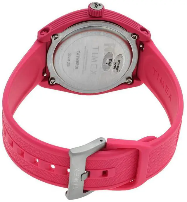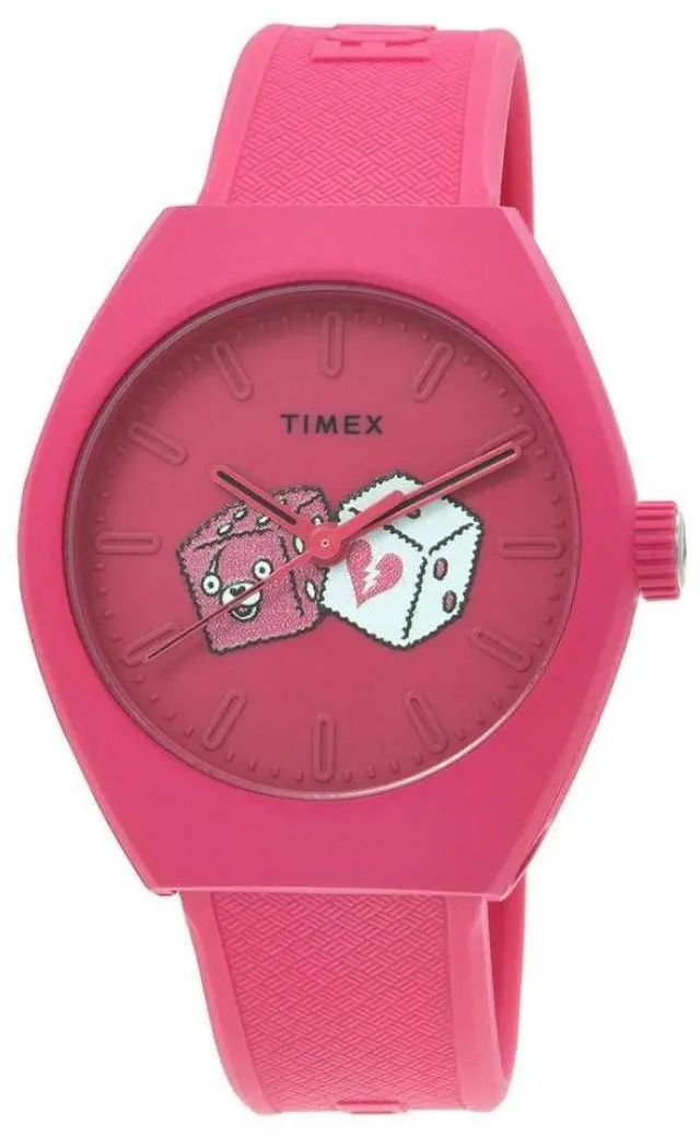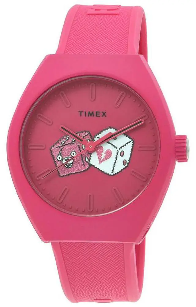 Pink bio-ceramic case with a pink bio-based pu band. Fixed pink bio-ceramic bezel. Pink dial with pink hands and index hour markers. Minute markers around the outer rim. Dial Type- Analog. Quartz movement. Scratch resistant mineral crystal. Pull / push crown. Solid case back. Case size- 40 mm. Case thickness- 12 mm. Band width- 20 mm. Buckle clasp. Water resistant at 50 meters.