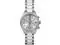 Case- Silver-tone alloy steel. Fixed silver-tone bezel with crystal set. Solid case back. Band- Two-tone (silver-tone and white) alloy steel bracelet. Closure- Deployment with push button release clasp. Dial- Silver-tone Analog type. Hands- Silver-tone luminescent (glow in the dark). Markers- Index and Roman numeral hour markers plus minute markers on the outer rim. Scratch resistant mineral crystal. Movement- Quartz. Chronograph. Date display at the 4 o clock position. Water Resistance- 30 meters. Case 38 mm.