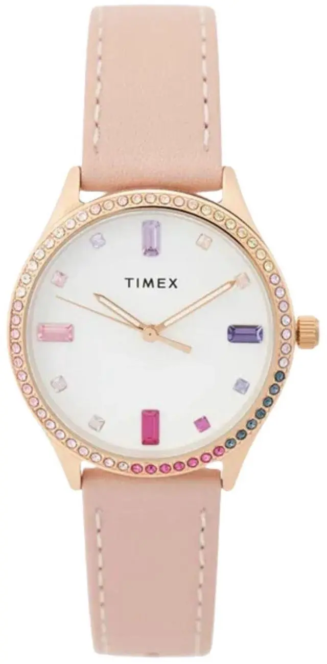 This dazzling Timex Womens Trend Dress watch operates with a dependable Quartz Analog movement. It features a delicate 32mm case in a soft rose gold-tone highlighted by a stunning rainbow crystal bezel and a clean white dial on a pink strap.