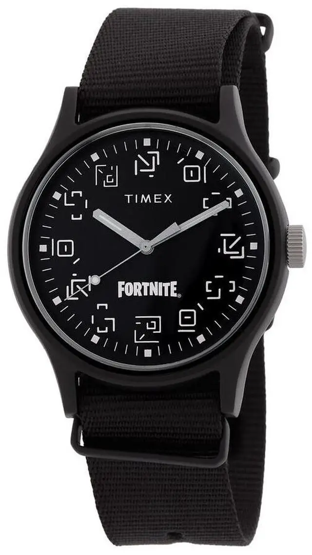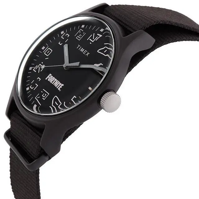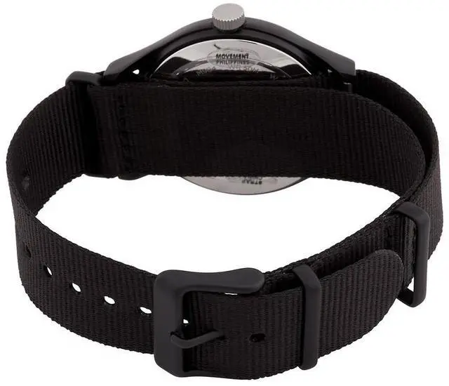 Black aluminum case with a black fabric strap. Fixed black aluminum bezel. Black dial with silver-tone hands. Minute markers around the outer rim. Dial Type- Analog. Quartz movement. Scratch resistant acrylic crystal. Pull / push crown. Solid case back. Case size- 40 mm. Case thickness- 12 mm. Band width- 20 mm. Buckle clasp. Water resistant at 50 meters.