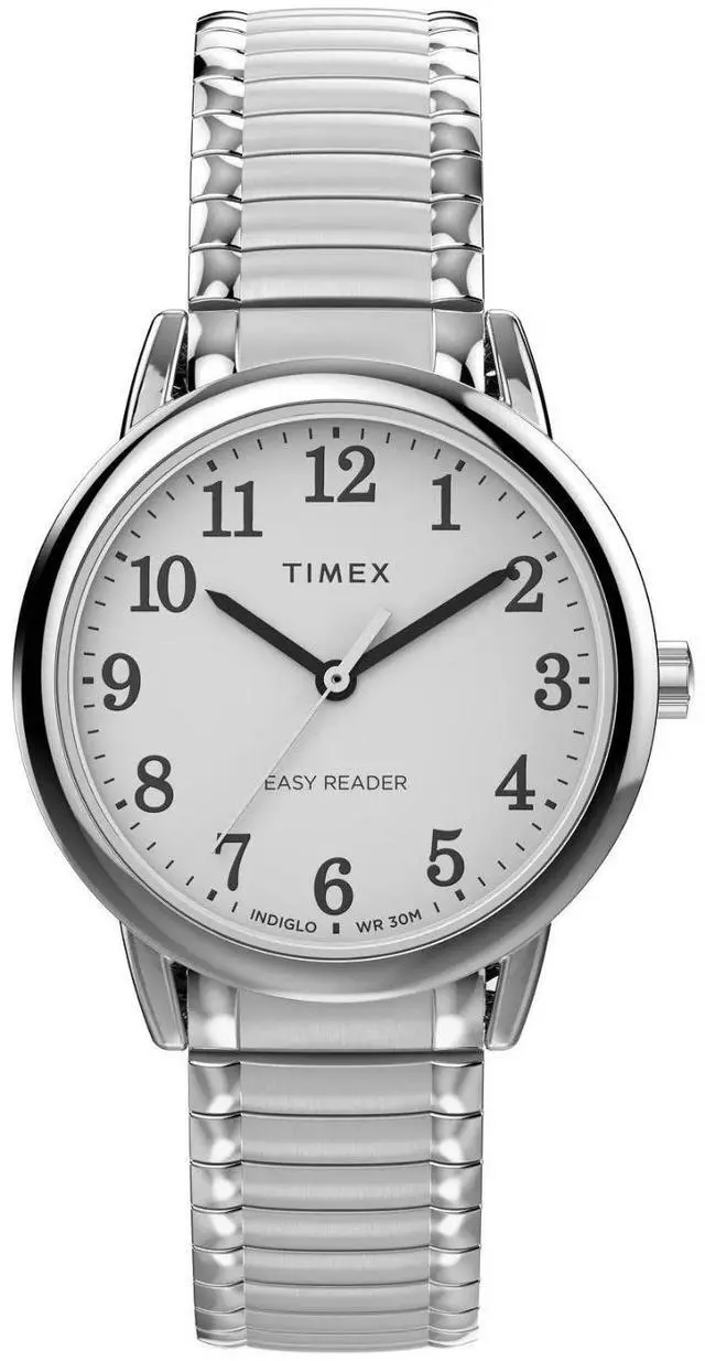 The quintessential Timex Womens Easy Reader Classic delivers timeless style and effortless readability thanks to its accurate Quartz Analog movement. This version features a clean white dial and a classic silver-tone case with a matching easy-to-wear expansion band.