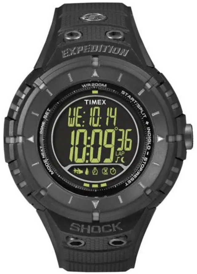This massive 48.5 mm Expedition Digital Compass is built for serious exploration featuring a rugged black case and strap and a digital display. The specialized quartz digital movement includes a digital compass temperature sensor and Indiglo backlight making it a true utility instrument. Its large size and shock-resistant design ensure maximum durability and visibility in extreme environments. This is a professional-grade outdoor tool watch. Case Material- Carbon Coated Stainless Steel (Rugged Black). Case Diameter- 48.5 mm (Massive Size). Band Material- Silicone/Rubber. Band Color- Black. Dial- Black and Green Multi-functional Digital Display.