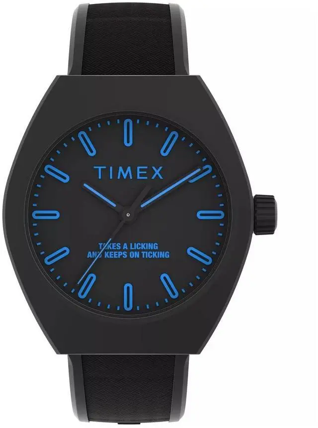 A stylish and sustainable choice from the Unisex Timex Trend collection this watch uses an accurate Quartz Analog movement. It features a 40mm black Eco Ceramic case with a black dial secured by a black Bio-TPU strap and accented with contrasting blue details.