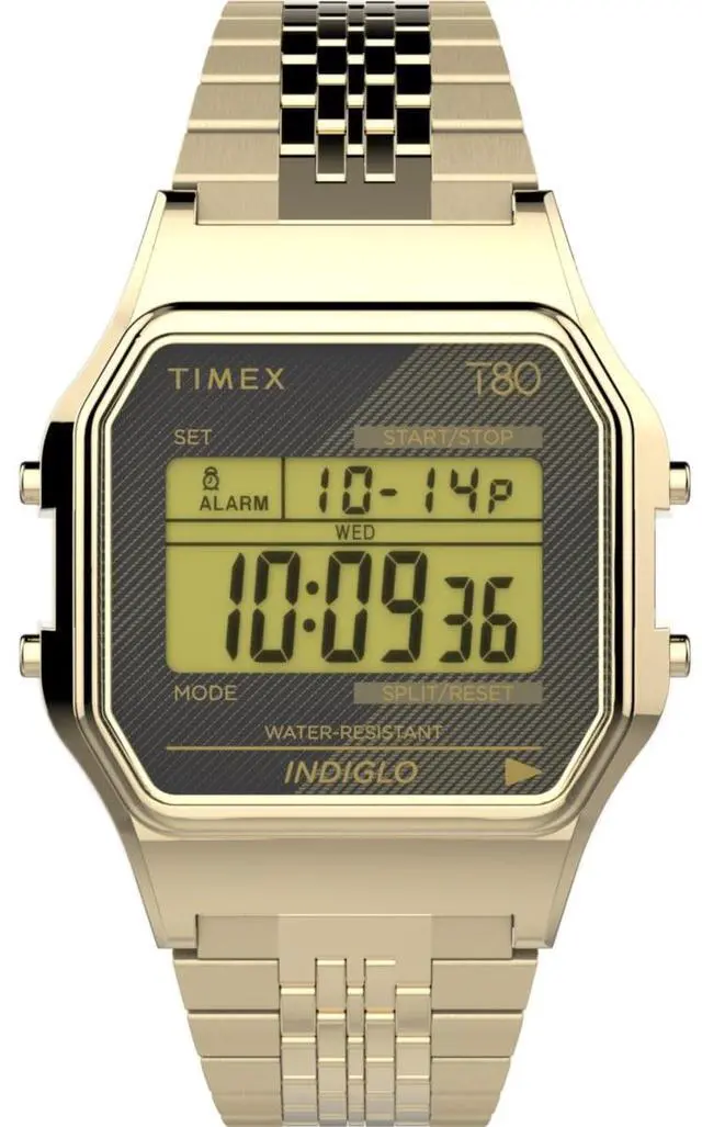 Step back in time with the 34mm Timex 80 featuring an unmistakable gold-tone bracelet and a digital display with a black lens. This iconic retro model uses a quartz digital movement offering features like a date stopwatch and alarm. The gold-tone finish and integrated bracelet make it a bold statement-making piece. Its the ultimate accessory for fans of 80s nostalgia and digital watch heritage.