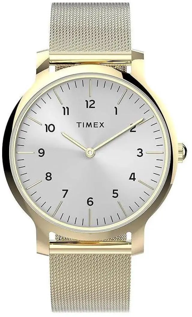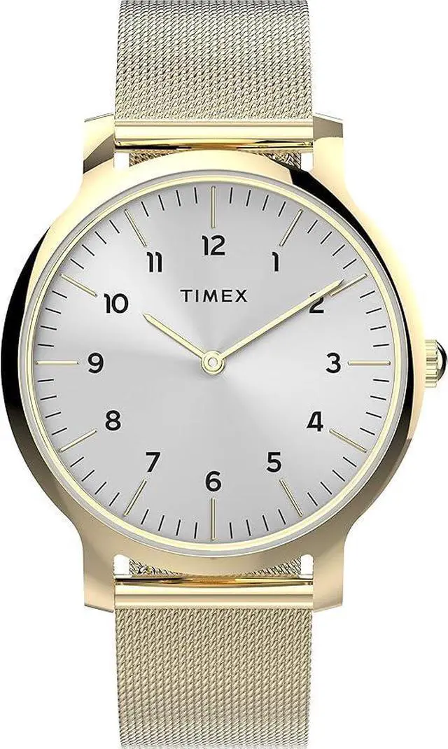 The 34mm Gallery Norway is a modern minimalist timepiece featuring a sleek gold-tone stainless steel mesh bracelet and case with a clean silver-tone dial. The simple and reliable three-hand quartz movement keeps the focus on the watchs clean lines and contemporary aesthetic. The mesh bracelet provides a fluid comfortable fit and a refined look. This watch is the epitome of understated elegance perfect for the modern woman.