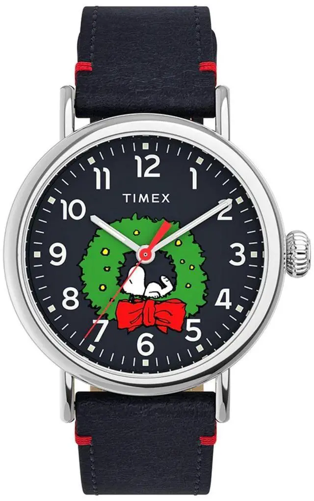 Capture the holiday cheer with the 40mm Peanuts Standard Christmas watch set in a silver-tone case with a vibrant blue dial and matching blue leather strap. The dial features an adorable Peanuts Christmas art design and the watch is reliably powered by a quartz movement. The fun colorful illustration provides a festive lighthearted touch to the classic Standard design. This is a charming collectors item for those who love the classic comic strip during the holidays.