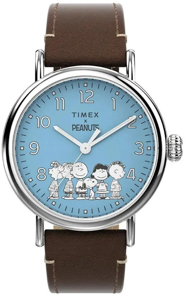 Celebrate the iconic comic strip with the 40mm Peanuts Waterbury Standard featuring the beloved Peanuts gang detailed on a vibrant blue dial housed in a silver-tone case. The watch uses a dependable quartz movement and is completed with a classic brown leather strap. The playful dial graphics add a nostalgic whimsical element to the sophisticated Waterbury silhouette. Its a perfect conversation starter for fans of Snoopy and the gang.