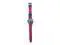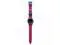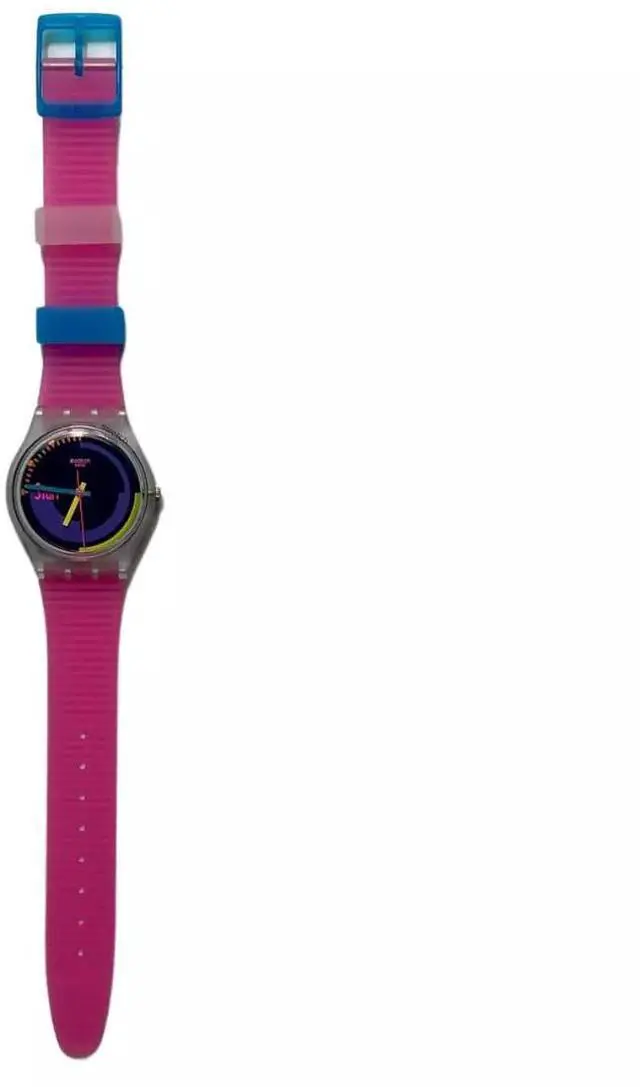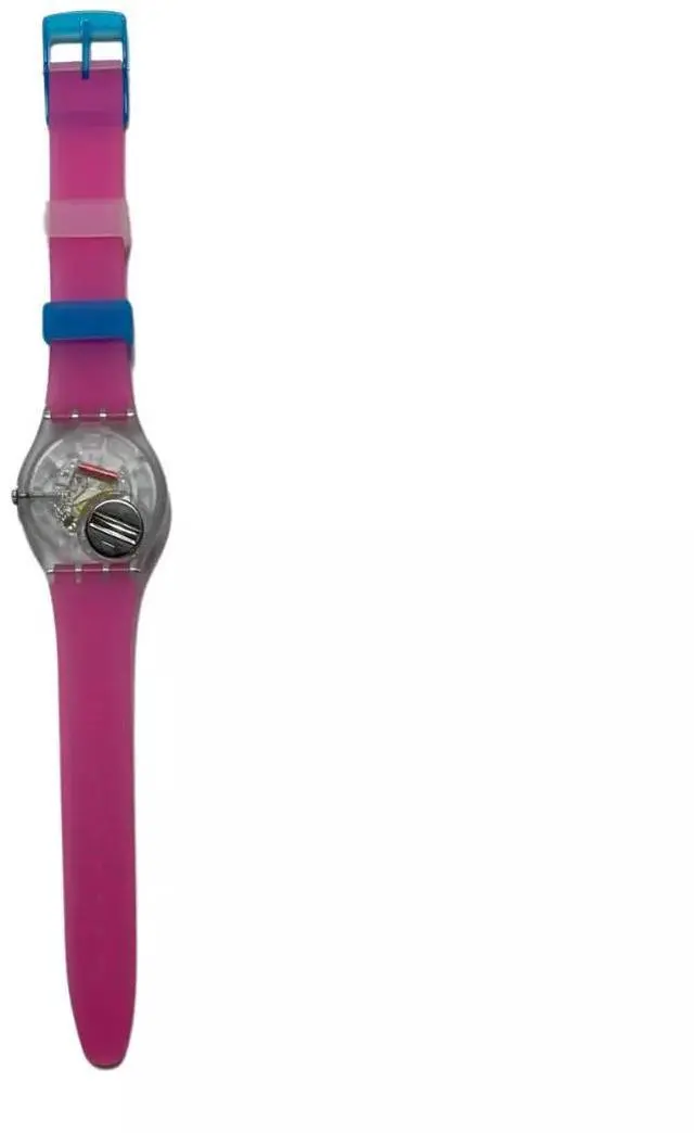 Swatch icon: PINK PODIUM (LK119). Its multi-colored dial features a yellow hour hand, blue minute hand, and pink seconds hand in a transparent matte biosourced case with biosourced glass. The transparent matte pink structured strap is complemented by blue and transparent matte loops and a transparent matte blue buckle.