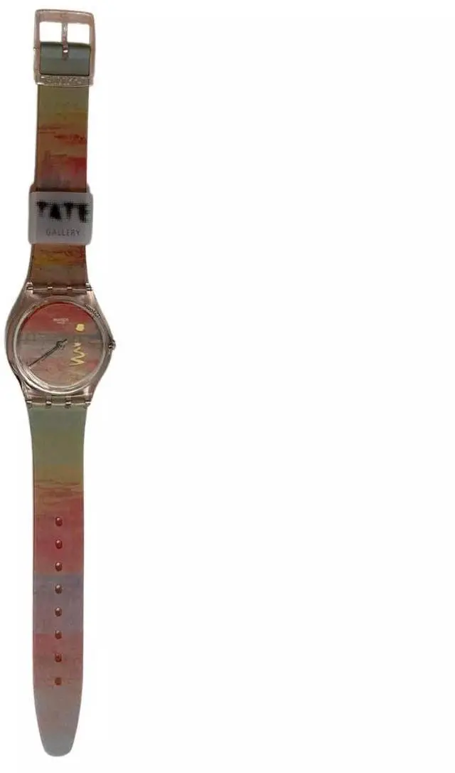 This watch from the Swatch x Tate Gallery Collection has a transparent matte blue biosourced case and biosourced glass. The dial features Henri Matisse's artwork The Snail printed in its entirety and black hour and minute hands. The transparent, shiny strap has a print of the artwork as well as the artist's signature. The transparent, shiny loops are printed with the Tate Gallery logo. Henri Matisse The Snail 1953. © Succession Henri Matisse/DACS 2024.