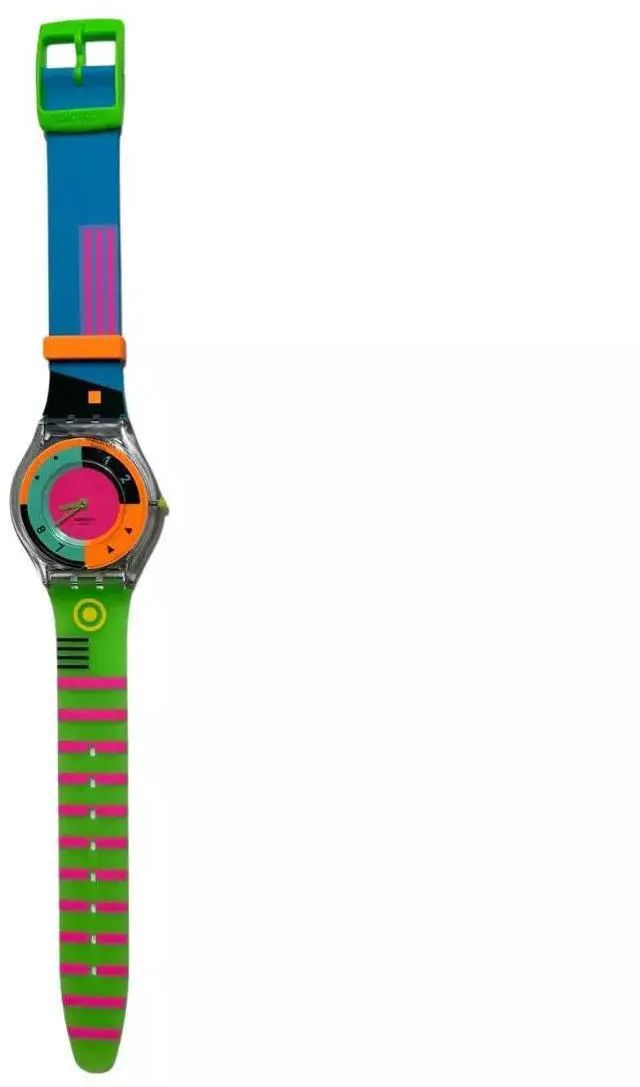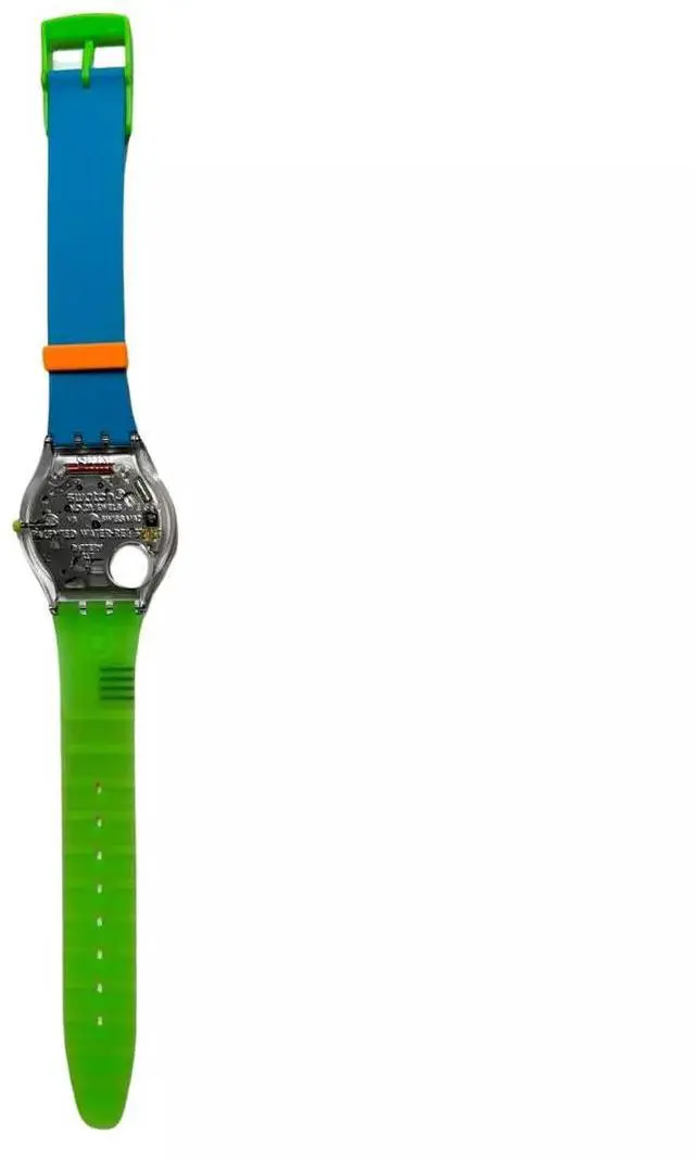 Swatch collectible: HOT RACER (LK115). The vibrant, multi-colored dial features green hour and minute hands in a transparent, shiny biosourced case with biosourced glass. The transparent matte green bottom strap and blue top strap have multi-colored prints that are complemented by the orange loop and green buckle.