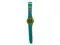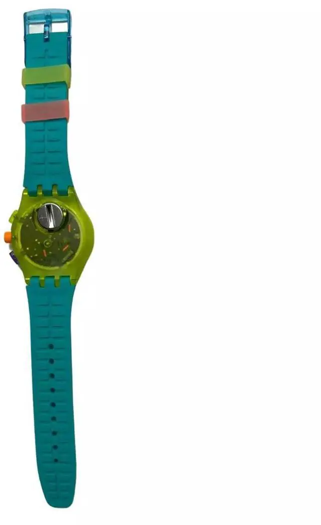 Swatch CHRONO: NEO WAVE (SCJ100). The multi-colored dial with tachymeter scale boasts glow-in-the-dark black hour and minute hands, an orange seconds hand and a day window at 3 o'clock. It has a transparent matte yellow case with a matching bezel. The structured turquoise strap is accented with contrasting transparent matte yellow and orange loops and a transparent matte blue buckle.
