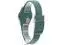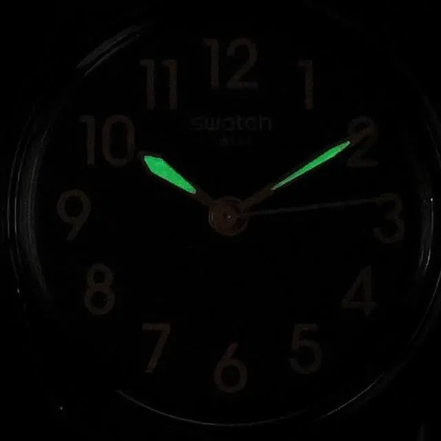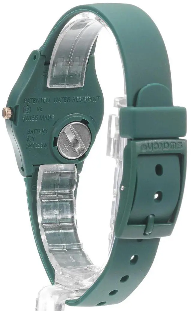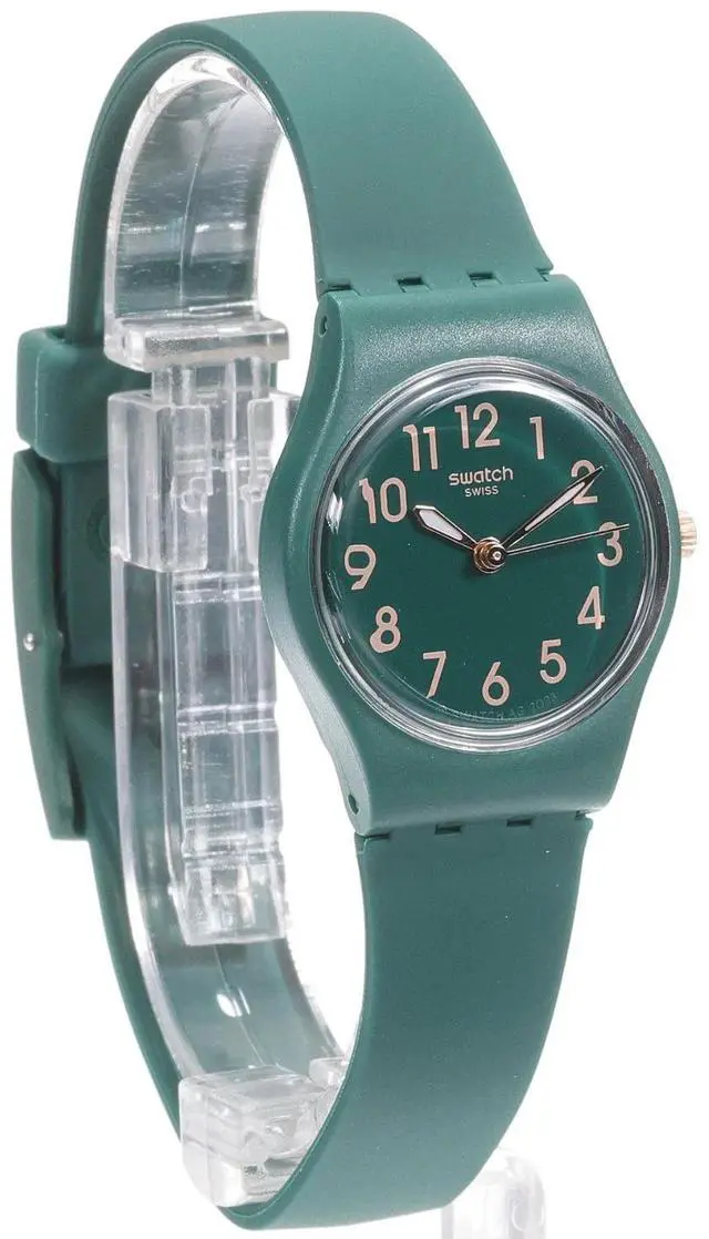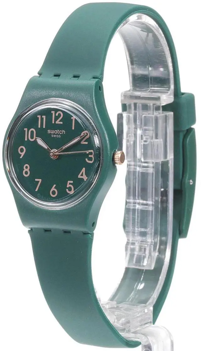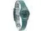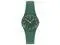 This watch features a dark green dial with beige printed numerals, rose gold-colored hour and minute hands with glow-in-the-dark effect and a rose gold-colored seconds hand in a matte dark green case. A matte dark green biosourced strap with matching loop and buckle completes the watch.