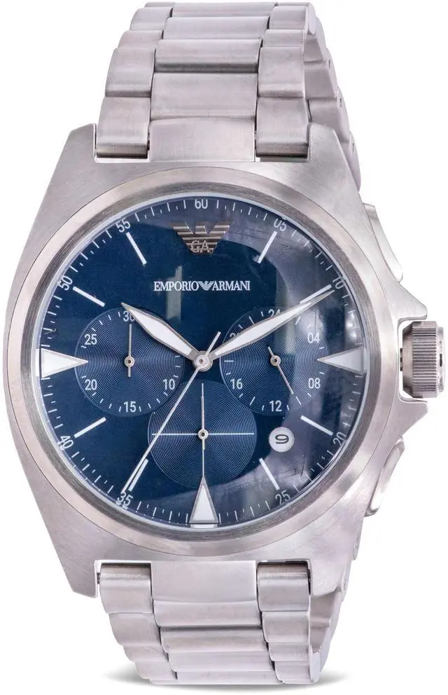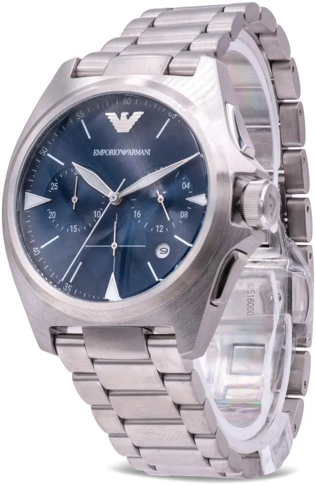 Stainless steel case. Stainless steel bracelet. Blue dial. Quartz movement. Date. Chronograph. Water resistant 50 meters. Case 41 mm.