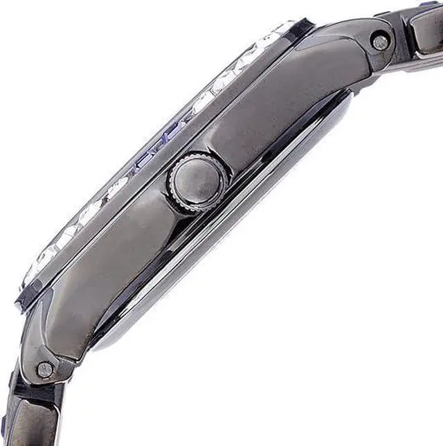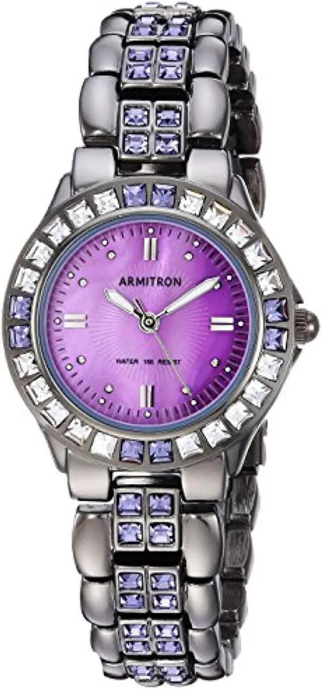 Case Material- Brass (Round). Case Diameter- 26.3 mm. Case Thickness- 7.7 mm. Band Material- Brass (Bracelet). Band Color- Gunmetal-tone (Gray). Band Width- 13.5 mm. Dial- Purple mother-of-pearl with luminous hands. Crystal- Mineral. Bezel- Brass with genuine crystals (Stationary). Movement- Japanese Quartz Analog (3-hand). Clasp- Push Button Foldover Clasp with Safety. Water Resistance- 50 meters (Suitable for short periods of recreational swimming). Special Features- Genuine crystals on band and bezel Luminous hands.