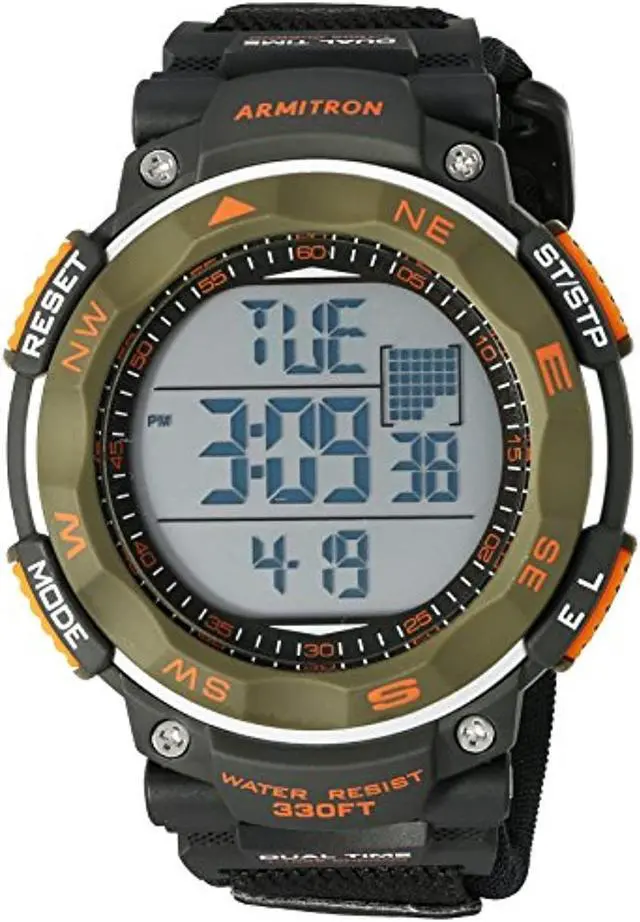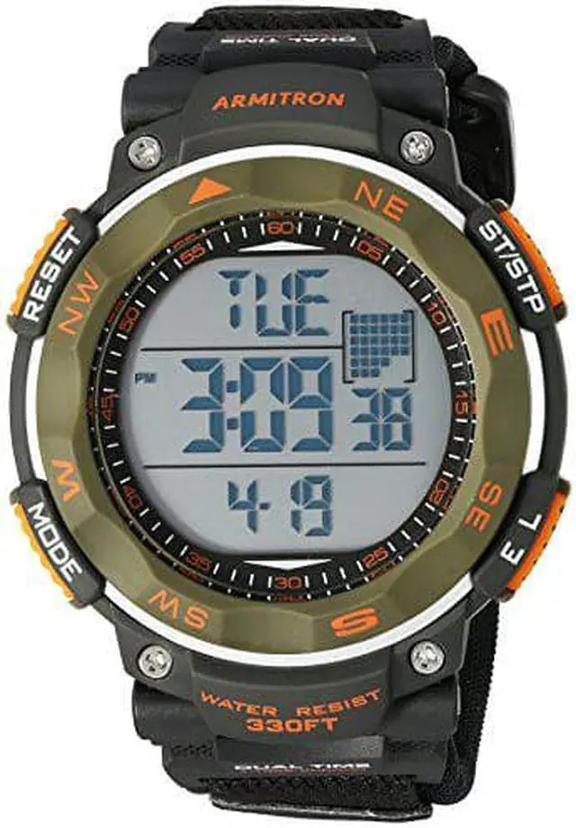 Case Material- Resin (Olive Green) with Graphic Top Ring (Round). Case Diameter- 51 mm. Case Thickness- 15 mm. Band Material- Neoprene/Nylon. Band Color- Black. Band Width- 25 mm. Dial- LCD (Gray display). Crystal- Acrylic. Bezel- Resin (Stationary). Movement- Quartz. Clasp- Hook-and-loop (Velcro). Water Resistance- 100 meters (Suitable for swimming and snorkeling). Functions- Time Seconds Day-Date-Month Chronograph Lap Time Alarm Dual Time Military Time and Backlight (with three second delay).