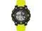 Case Material- Resin (Black Round). Case Diameter- 54 mm. Case Thickness- 16 mm. Band Material- Resin. Band Color- Lime Green. Band Width- 22 mm. Dial- LCD (Gray display). Crystal- Acrylic. Bezel- Resin (Black Stationary). Movement- Quartz. Clasp- Buckle. Water Resistance- 100 meters. Functions- Time Seconds Day-Date-Month Chronograph Lap Time Alarm Dual Time Military Time and Backlight.