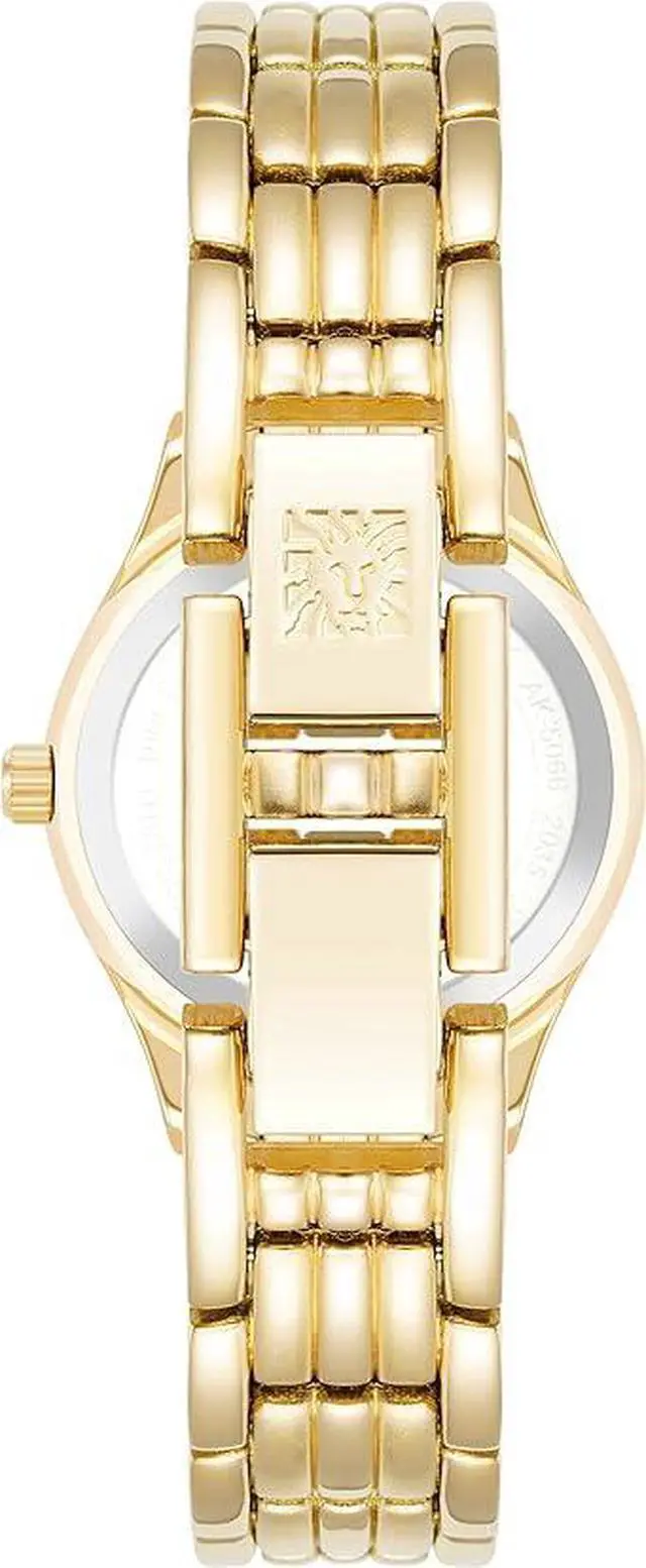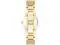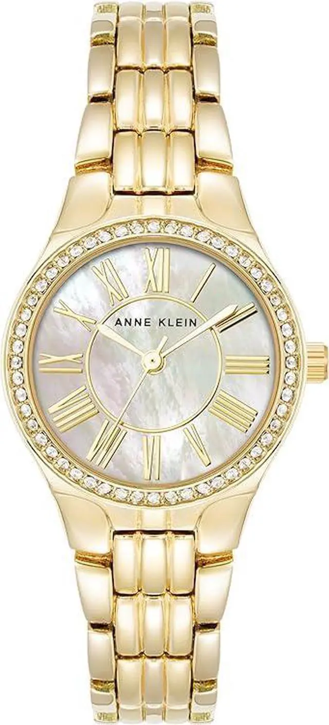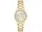 Case Material- Metal (Round). Case Diameter- 26 mm. Case Thickness- 8.5 mm. Band Material- Metal. Band Color- Gold. Band Width- 13 mm. Dial- Mother-of-pearl with gold-tone hands and Roman numerals. Crystal- Mineral Glass. Bezel- Set with 52 clear premium crystals. Movement- Japanese Quartz. Clasp- Jewelry Clasp with Extender. Water Resistance- 30 meters.